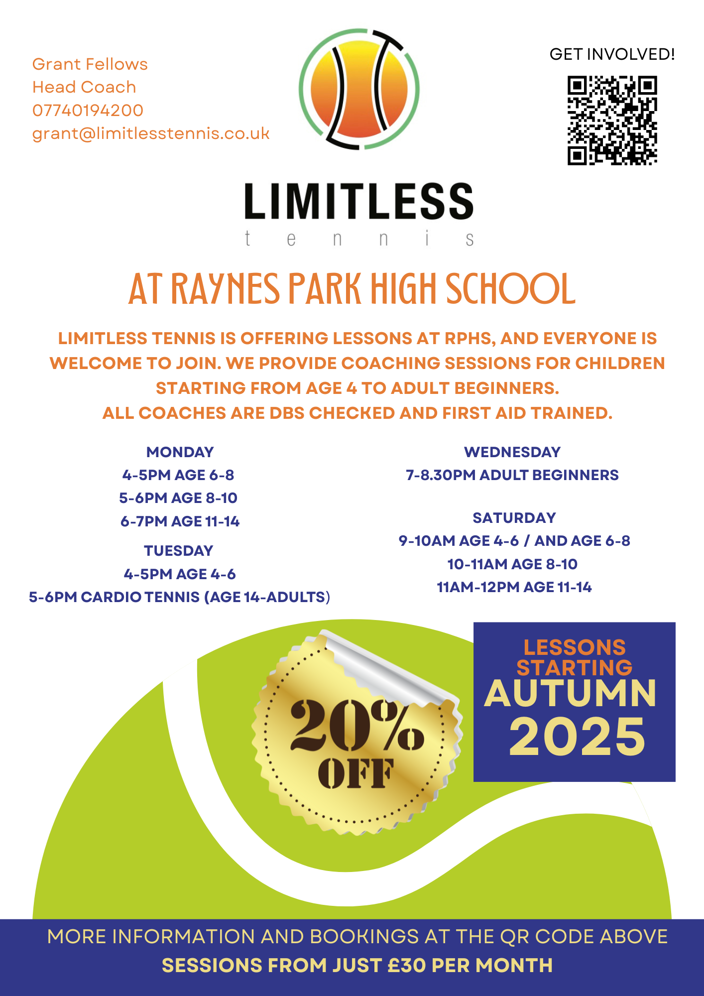Limitless Tennis provides tennis to the students at Raynes Park High School with LTA qualified coaches. The interest in tennis is growing through curriculum tennis lessons during P.E, the after-school tennis club on a Tuesday, 3.00-4.00pm, and additional tennis coaching opportunities. More details of after-school tennis can be found below.