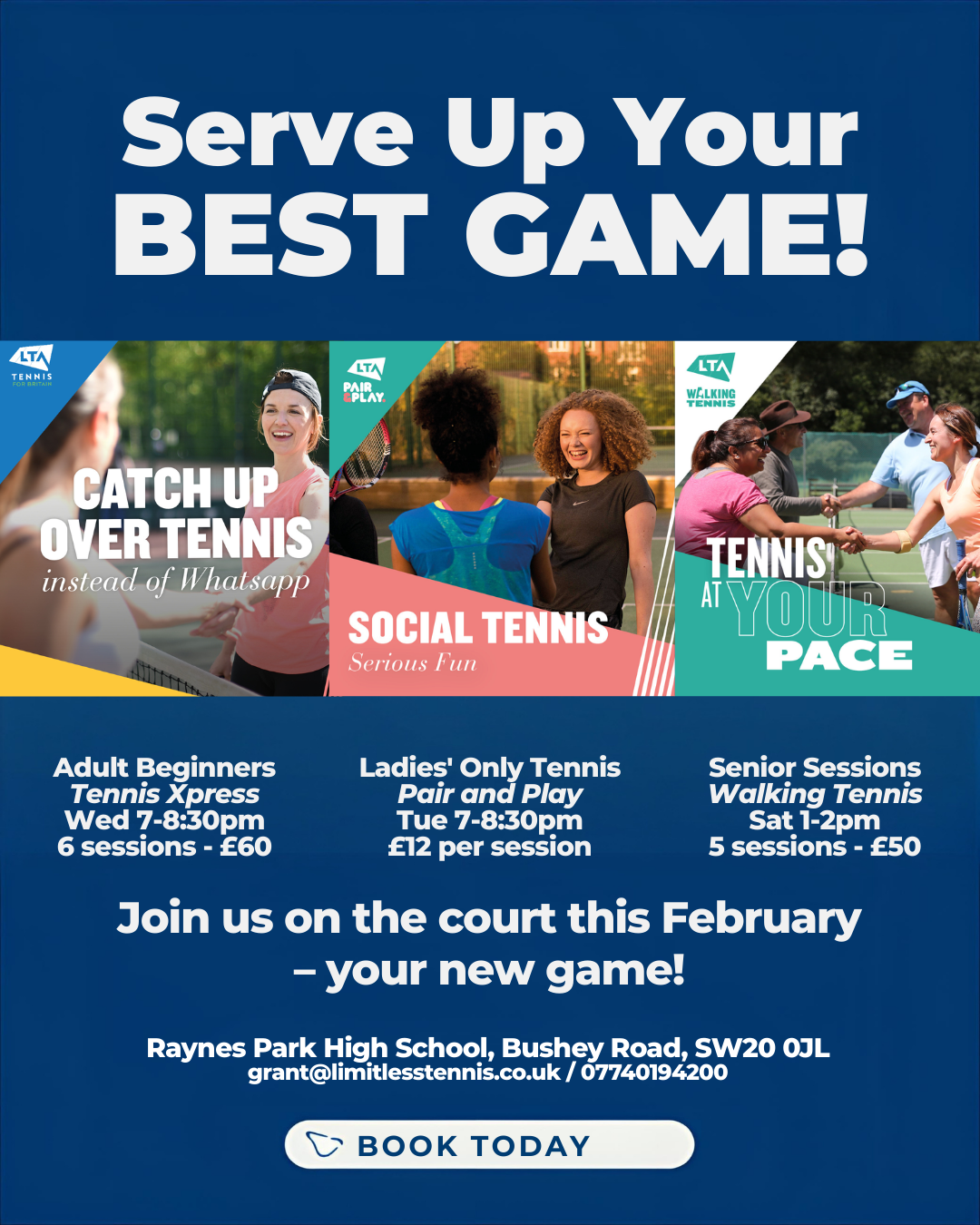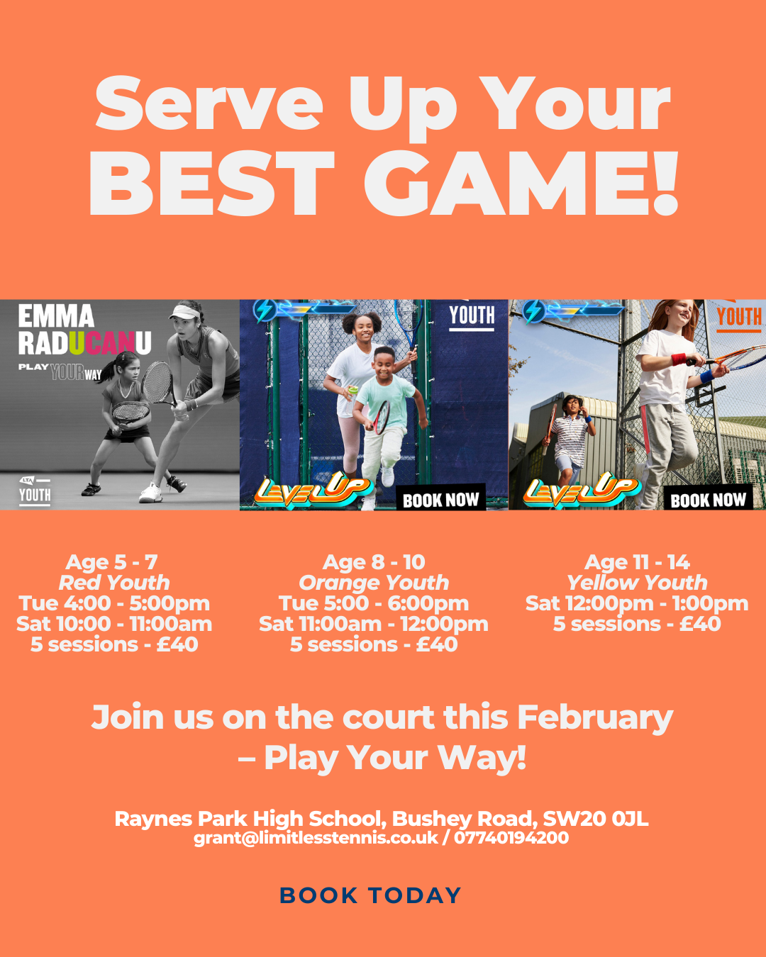 Limitless Tennis are also providing lessons for the local community at Raynes Park High School, for all ages from 4 to adult lessons. Join the starter courses and then continue with us from just £40 per month. Check out the following link to register Clubspark / Raynes Park High School / Tennis Coaching Wimbledon Raynes Park High School.